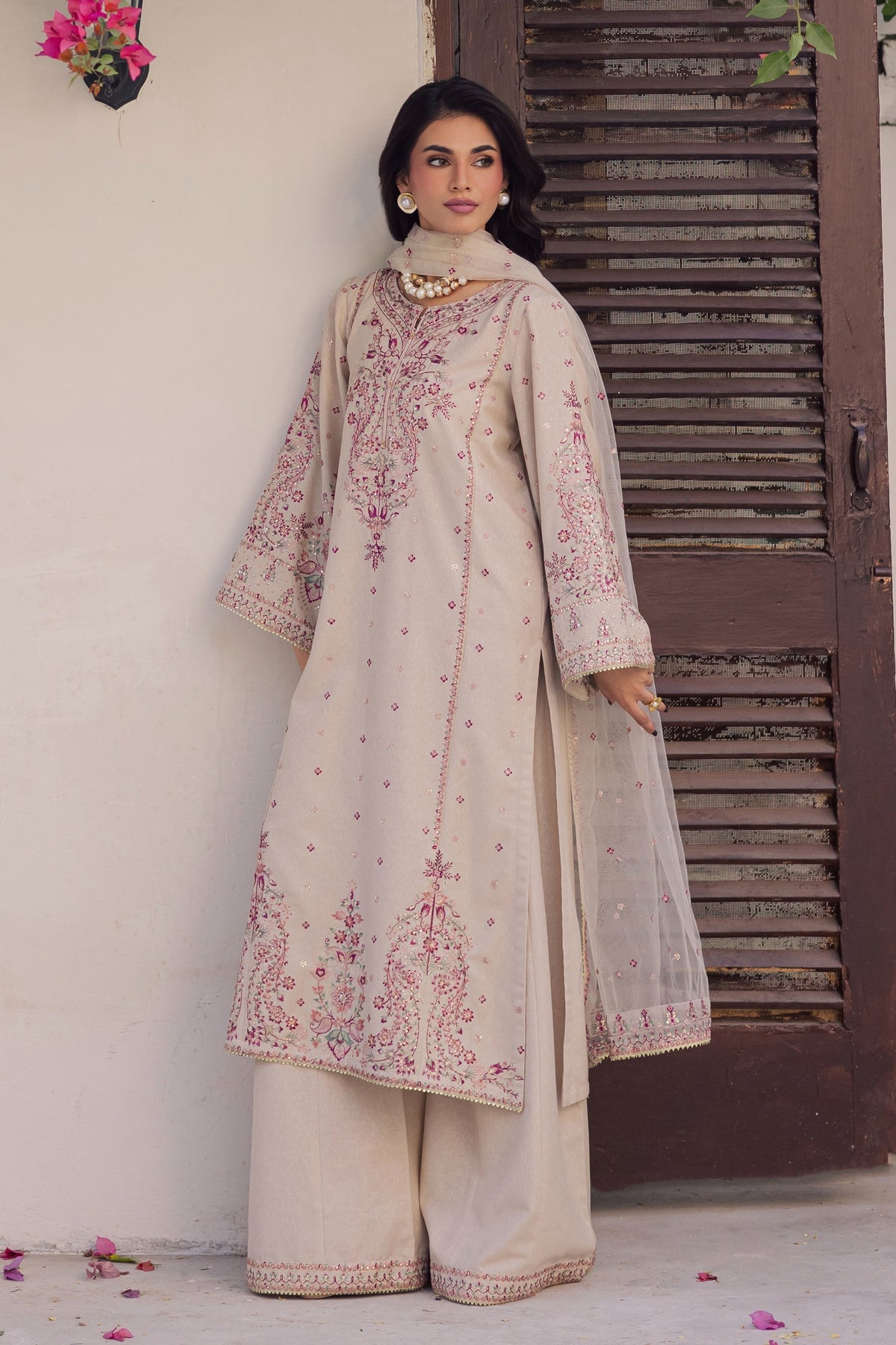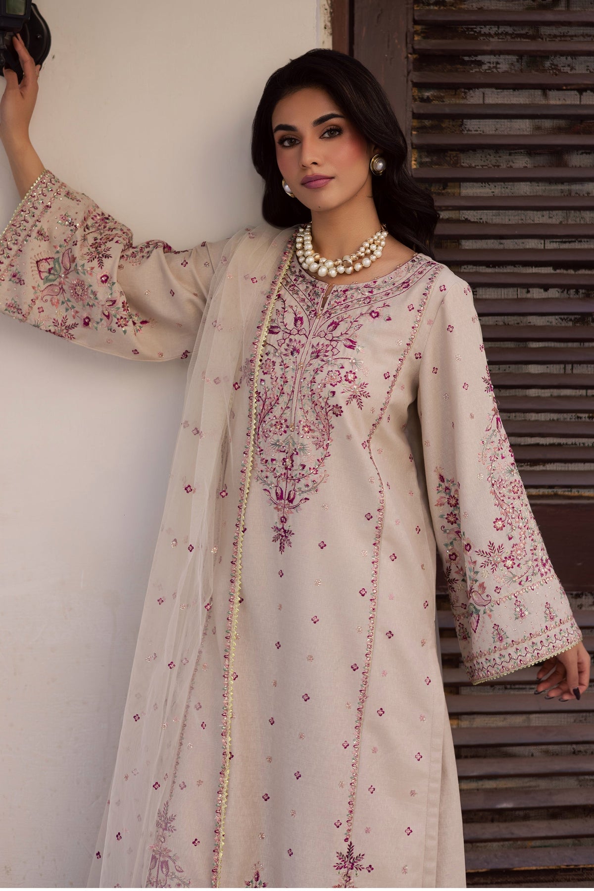 QALAMQAR-3PC LAWN EMBROIDERED SHIRT WITH KHAADI NET EMBROIDERED DUPATTA AND TROUSER-WAC-5754