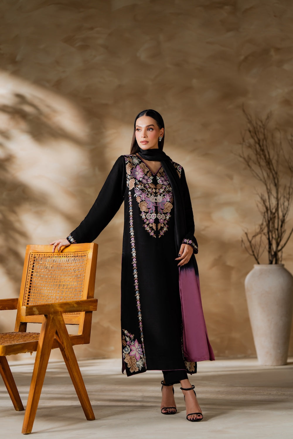 SUFFUSE-3PC LAWN CHIKAN EMBROIDERED SHIRT WITH CHIFFON PRINTED DUPATTA AND TROUSER-WAC-5731