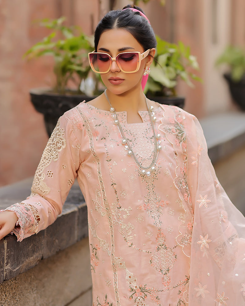 ELAF-3PC LAWN CHIKANKARI EMBROIDERED SHIRT WITH CHIFFON PRINTED DUPATTA AND TROUSER-WAC-5771