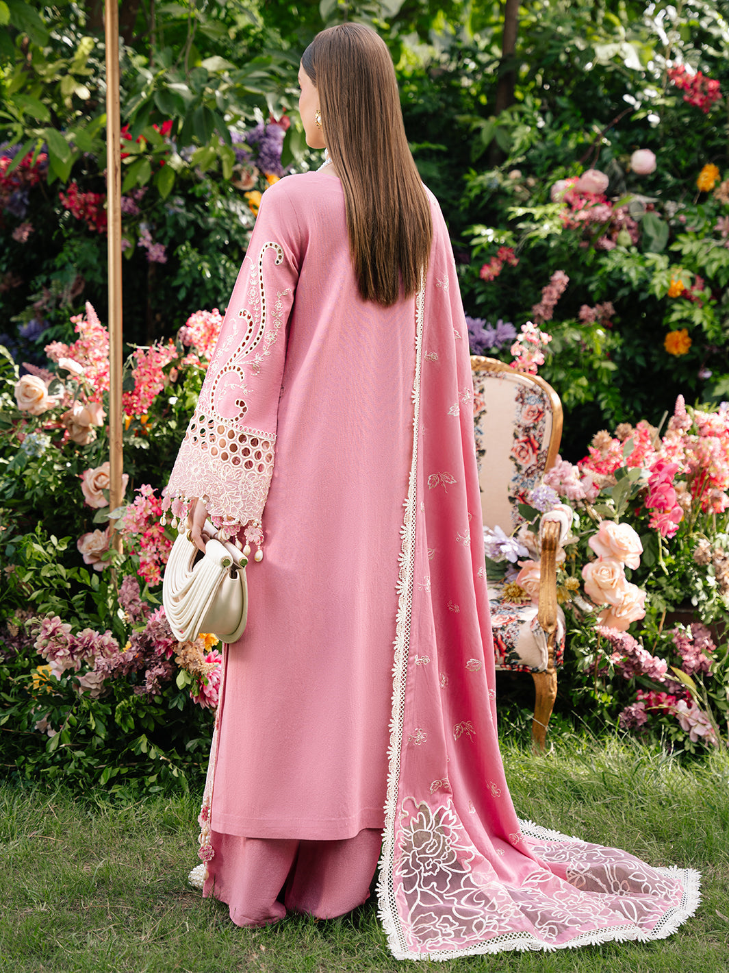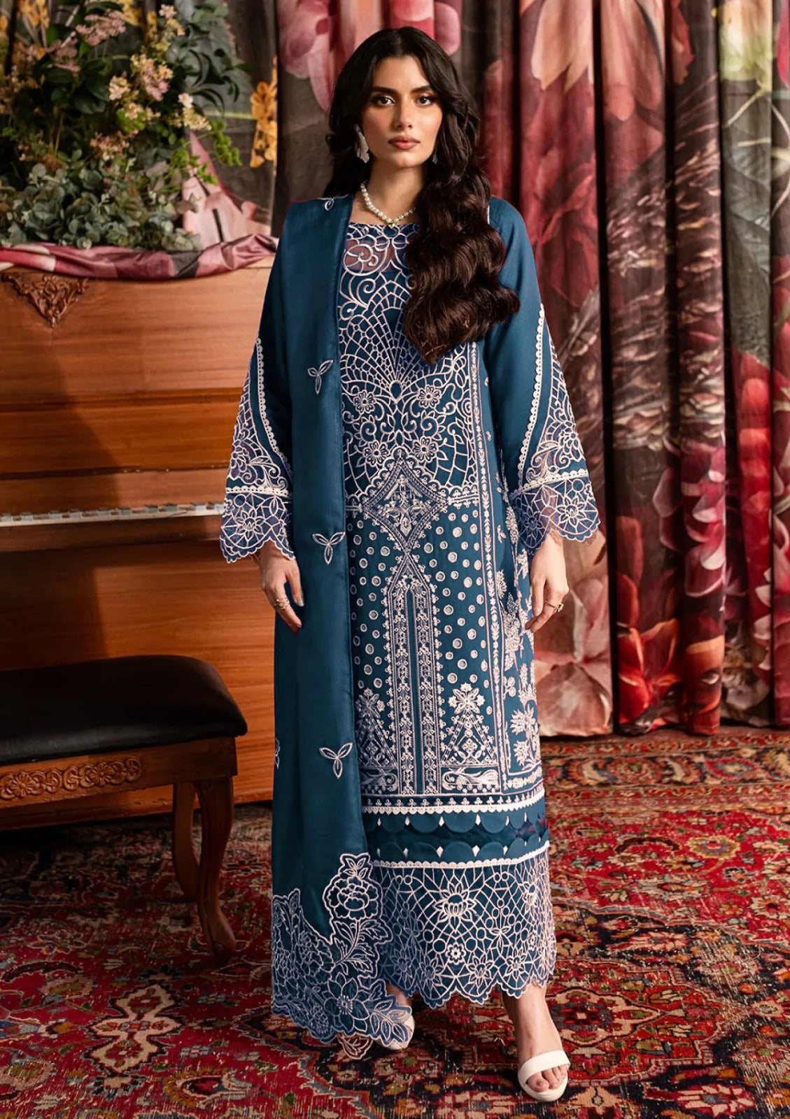 QALAMQAR-3PC CHIKANKAARI LAWN LASER WORK EMBROIDERED SHIRT WITH KHADDI NET EMBROIDERED DUPATTA AND TROUSER-WAC-5712